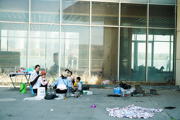 当阳光穿过商场的残垣断壁,照射在发绿的水沟和远处的天嘉湖面上时,一个男人正举着一根三米多长的鱼叉,想在一栋临水而建的白色大楼旁试试运气。透过大楼空荡的玻璃向后看,他的朋友们正在大楼门前席地而坐,享受着啤酒和西瓜。