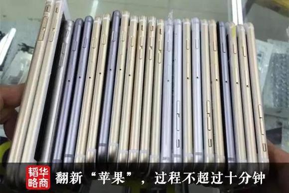 手机翻新是行业内公开的秘密,“翻新机”指的是二手手机用化学液体清理干净,重新换外壳,配上假冒的电池、充电器和包装,当作新机销售。