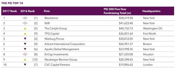 这里有两个统计,按照管理资产总规模计,最大的是黑石集团(Blackstone),2014年管理资产总规模2,904亿美元,虽然都姓“黑”,但Blackstone还是比Blackrock小很多,只是一个零头;按照PEI的统计,过去五年募集资金最多的是凯雷集团(Carlyle),共319亿美元,黑石是255亿美元左右。