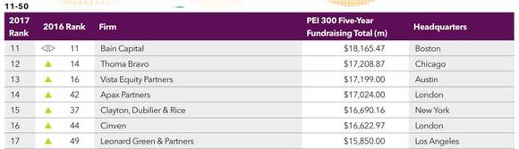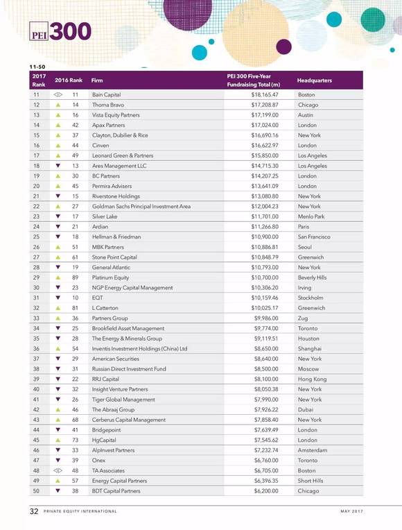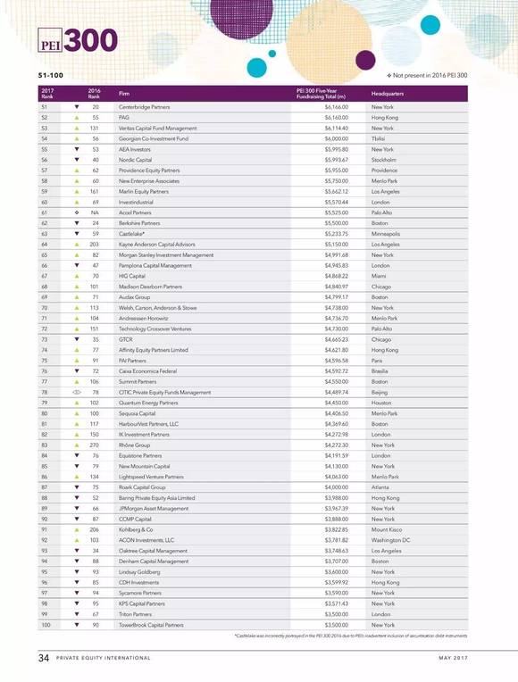 上周末(5月7日),伦敦最具权威的全球另类资产投资(私募股权,债权投资,房地产,etc.) 排名媒体Private Equity International发布了2016年最新的全球私募股权机构排名。按照过去五年的融资额进行排名,在各个机构IRR并不透明的今天,融资额作为一个代表专业市场认可度的指标,以五年为限,具有相当的公信度。 这里主要提及在中国有业务的外资PE以及部分国内本土的主流玩家,先看前十七名(将在大陆比较活跃的Silverlake包括进来)。