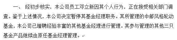 19日早间,中邮基金官网公告称邓立新因其个人行为,正在接受相关部门调查,目前邓立新基金经理职务已被暂停,邓立新被带走调查一事终于经官方核实。