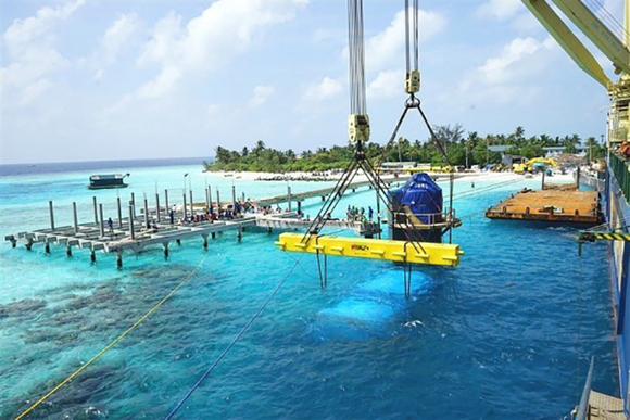 这家独一无二的海底餐厅耗资500万美元,总重175吨的餐馆主体结构建造在新加坡完成。9个月后,基本组装好的餐厅才被吊至一艘远洋驳船运往马尔代夫。在85吨装沙压舱物的帮助下,餐厅被精确地放置在打入海床4至5米深的4根钢柱上,沉到海底并用混凝土牢牢固定。