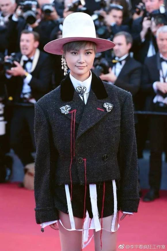 今年的红毯造型:高礼帽,短夹克,短裤,长靴,