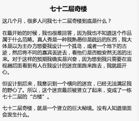 作为中国悬疑探险小说界的领军人物,南派三叔首次进军真人秀领域的作品,就是他创造出的“七十二层奇楼”。