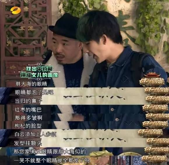 之后在找拍卖会的线索时,面对各种刁难大家也都机智地化险为夷。在利用中药药材拼出张美丽的画像时,看到“胖大海的眼睛”后,机智如大张伟调侃道:“那您家闺女眼睛跟胖大海似的,一哭不就整个眼睛都全发了吗?”