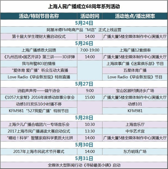 上海广播多个频率还将在本周推出多档互动节目和特别直播,为上海人民广播庆生。