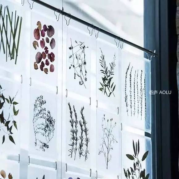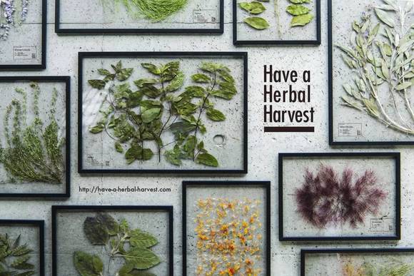 原来这是一场食与艺相结合的展览"Have a Herbal Harvest" ,那些曾美丽夺目的花草,或內向谨慎、或活泼喜庆、或随性大器,被精心地制成标本保存在一片片透明的胶片里,时序之美瞬间被定格其中。无论是直接靠放在墙壁,或是张贴起来,都十分迷人。