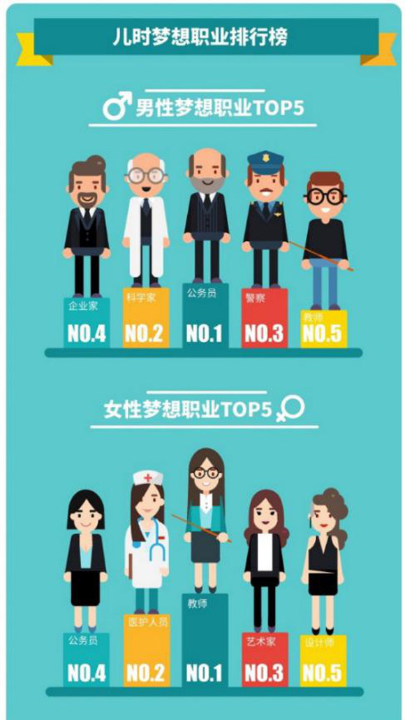 据领英儿时梦想调查,无论是哪个年龄段的职场人,小时候最普遍的梦想都是公务员、教师、科学家、医生这类稳定且社会声望较高的职业。年少时的职业梦想往往来源于当时的所见所听,与个人成长环境有很大关系。而大多数小孩的可见范围内无非是几个常见的传统工作,或只是随口说的孩子气答案,很容易就忘了,真正能兑现的少之又少。