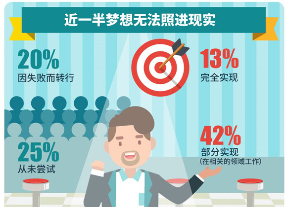 数据显示,仅13%的梦想照进了现实,其中“钱”是最大的阻碍。对于在职场打拼的人来说,随着工资涨幅远远赶不上房价、物价的走高,谈梦想成了奢侈。有超过一半人表示,只有当衣食无忧之后才会去考虑梦想。“当下不同行业薪资水平差距较大,在面对兴趣与物质保障发生冲突时,职场人往往被迫选择后者。做出这样的选择也是顺应了父母期待、家庭需要、以及社会对财富积累的普遍崇拜。”领英中国技术副总裁王迪表示。