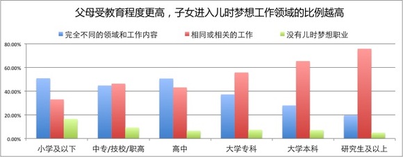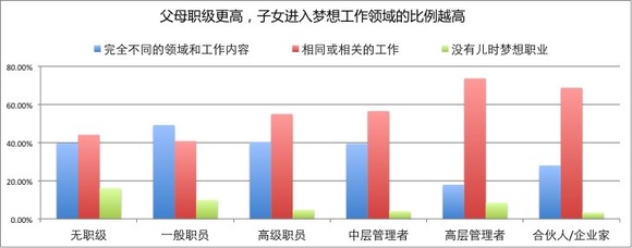 调查数据显示,父母最高的学历或者工作职级越高,其子女实现梦想职业的比例越大。当父母最高学历在研究生及以上时,其子女从事与梦想职业相同或相关工作的比例高达75.6%,是父母最高学历仅小学及以下的两倍多;当父母为高层管理者或企业家时,其子女从事相同或相关工作的也占7成以左右,明显高于父母为中低层职员的情况。