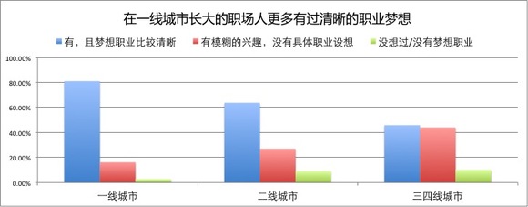 虽然绝大多数都至少有模糊的兴趣,但家乡城市发展程度越高,小孩的梦想职业愈发清晰。一线城市长大的职场人儿时有比较明确理想职业的比例几乎是三四线城市的两倍。