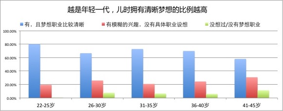好趋势是,从70后到90后,不仅小时候一代比一代目标更清晰,出现的职业选择也是越来越多样化。超过一半的70后儿时梦想集中在前五名的职业里,在80后里这种集中趋势下降为48%,而90后最低,只有40%。这与互联网的普及和社会价值观的逐渐多元是分不开的,年轻一代获取信息的渠道更开放和自由,不再局限于传统媒体或亲戚朋友,他们的梦想职业也基于自身兴趣变得更为分散。也许在未来,立志要当科学家的小孩少了,但最终实现儿时职业梦想的人却越来越多。