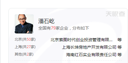 作为一个地产界传奇人物,他的资产自然也成了大家关注的焦点。据侦探君(微信公号:JRJZT999)多方查探,潘石屹担任法人的公司就有54家,对外投资的至少有8家,看来潘总涉足广泛,在他手上全国一共有近七十九家企业!