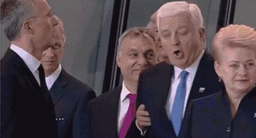在北约峰会上,特朗普还做了一件事,领导人集体亮相合影时,他一把推开了挡在前面的黑山共和国总理马尔科维奇,挤到队伍的最前方,旁若无人地抖了抖西服。这一举动被媒体调侃为“特朗普用行动证明谁才是北约的老大”“弱国无外交”。