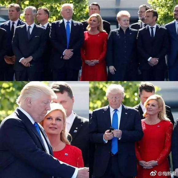 可能只有克罗地亚女总统较为明显地表达了对特朗普的欣赏,在峰会合影时,有点脉脉含情地仰望着他……