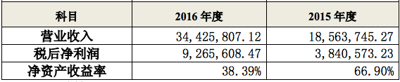 粉丝科技2015、2016年度的营业收入分别为人民币1856.3745万元、3442.5807万元,税后净利润分别为384.0573万元,926.5608万元。