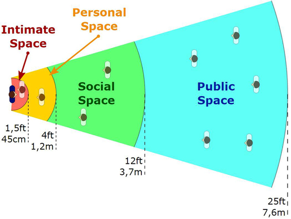 这个小小的案例再次印证了爱德华·霍尔关于人与人之间的空间距离的理论:这位美国人类学家经研究发现,人与人之间有四种空间距离,包括亲密距离、私人距离、社交距离和公共距离,其中,私人距离(Personal Distance)是人们在日常生活、社交中区分熟稔的朋友、家人与陌生人之间的不可逾越的界线。但同时,他也指出,我们对于人和人之间的空间距离的大部分举动及观念,都是无意识的,我们的文化传统决定了令我们感到舒适的空间距离和行为,但我们自己却很难对这种因果关系给出清晰具体的分析。