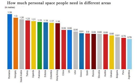 从上图可以看出,最为珍视私人空间的是罗马尼亚人,合适的距离得保持1.39米,可以据此想象一下这样距离下人们的交往状态,要时刻谨言慎行,以免侵犯他人的私人空间。匈牙利人紧随其后:1.3米,私人空间的距离仅比罗马尼亚人少了9厘米;而阿根廷人则是相对最为好客、开放的民族,你可以站在距他们76厘米的地方谈笑风生——也由此解释了文章开头的故事发生的原因。