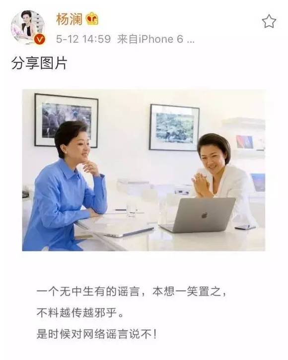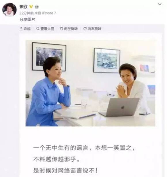 近日,国内两大知名的职场女性杨澜和张欣在网上晒出了一张耐人寻味的同框合照,并附有一段话:“一个无中生有的谣言,本想一笑置之,不料越传越邪火。是时候对网络谣言说不!”