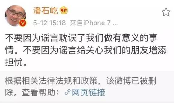 随后,张欣的丈夫、SOHO董事长潘石屹也在同一日转发该微博,称“不要因为谣言耽误了我们做有意义的事情。不要因为谣言给关心我们的朋友增添担忧。”不久,张欣删除了此微博。