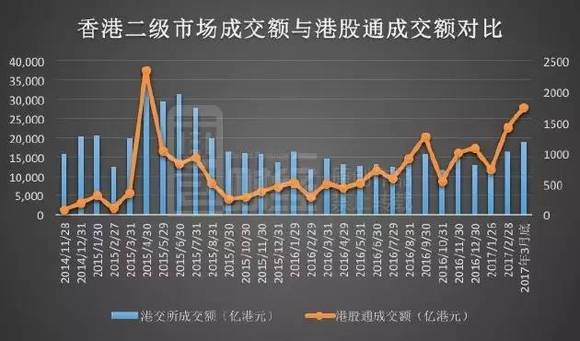 内地投资者正成为香港证券市场的越来越重要参与方。据统计,2017年3月,港股通交易额为1742.02亿港元,与上年同期相比上涨了2.45倍;同期香港二级市场成交额仅上涨了29.2%。今年3月份,港股通交易额占香港二级市场交易额的比重已达到9.22%。下图为面包财经根据Wind数据绘制的香港二级市场成交额与港股通成交额对比: