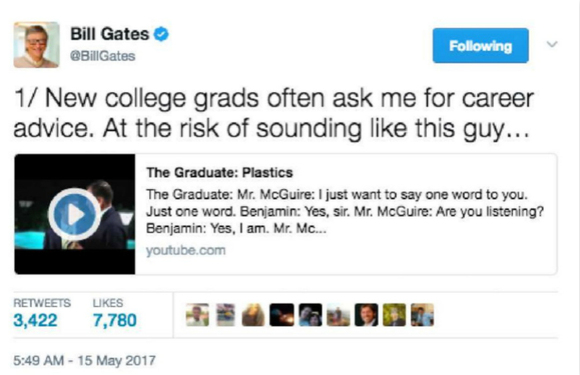 5月15日,比尔盖茨选择以最直接的推特方式将他的信息传达给广大17届毕业生:从未来世界发展大趋势到个人修身齐家,他言简意赅地给了年轻人最需要的建议。