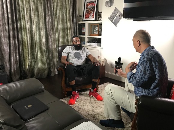“常规赛之后有一个很好的间歇期,我们最终协调到了这段时间。哈登在训练间隙带我们去了他家,他的学校,还帮我们打电话给他的高中教练。他妈妈也非常辛苦,全程都在帮我们协调,还让我们完整的采访了两次。”