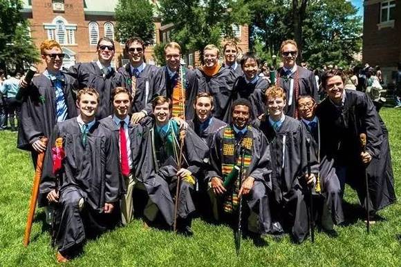 虽然身上没特色,但还能外加些道具不是么?部分达特茅斯学院的毕业生,会选择搭配一个独具特色的手杖出席典礼。虽说这不是学校的官方规定,但慢慢也变成了达特茅斯学院毕业典礼上的一道独特风景。