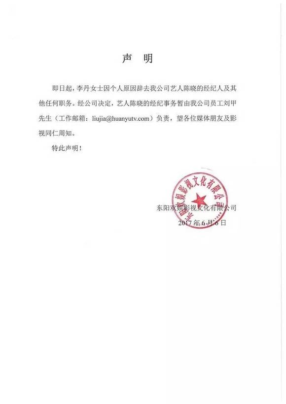 陈晓工作室发声明宣布经纪人李丹辞职。有网友爆料,陈晓经纪人辞职的原因和粉丝炮轰有关。之前,陈晓的粉丝就曾列出经纪人的多宗罪,包括资源能力差、宣传营销不上心、对艺人被黑置若罔闻、沟通能力差等等。并要求李丹辞职。