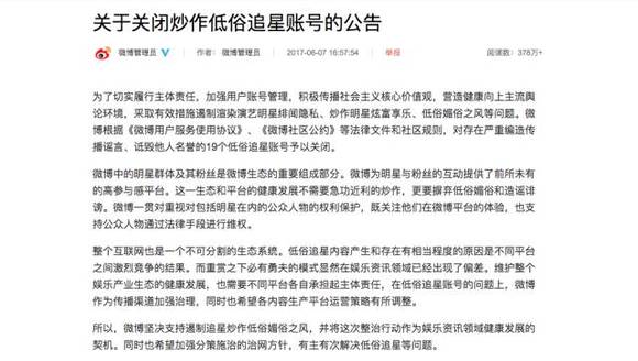 在下午的官方声明中,微博承认“明星群体及其粉丝是微博生态的重要组成部分”,但微博的“健康发展不需要急功近利的炒作,更要摒弃低俗媚俗和造谣诽谤”。