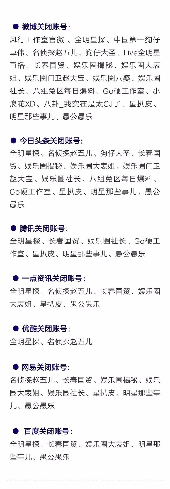 被约谈过后的众家网站迅速做出处理,依据相关法律法规、网站内容管理规定及用户协议对其平台下众多违规娱乐账号进行了关闭,速度之快令这些混迹娱乐圈多年的“老江湖”们都还没来得及做出反应,就被杀了个措手不及。下午17:00左右,微博官方正式发布了《关于关闭炒作低俗追星账号的公告》,同时一份各平台封禁账号名单也迅速传遍了整个娱乐圈。
