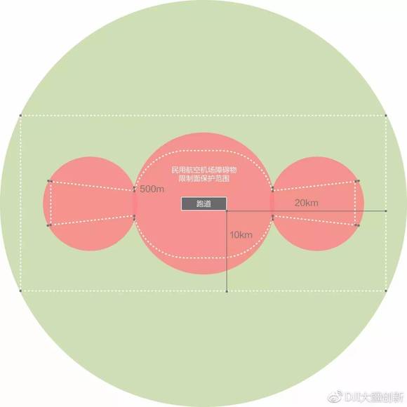 可以看出,大疆的做法还是比较保守的,在原本障碍物保护面的基础上外延了500m,没有紧贴保护面进行禁飞区的划定,留足了缓冲空间。