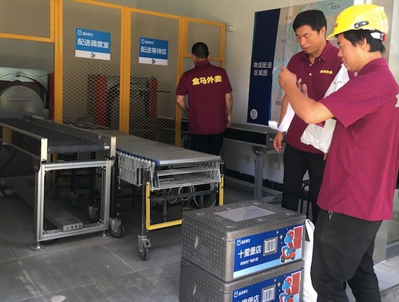 盒马鲜生相关负责人员介绍,盒马鲜生采用前店后仓的模式,门店顶端设置了传送带,线上订单通过传送单传至配送仓,做合并订单、打包,然后交给配送员送出。理想状态下,拣货控制在10分钟之内,配送时间尽量控制在20分钟之内。
