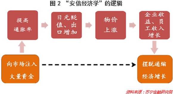这“三支箭”的逻辑相当“耿直”:通过向市场注入大量资金,提高通胀率,使得日元贬值、出口增加,进而物价上涨,企业收益增长,员工的收入也相应增长,最终摆脱当下的通货紧缩困境,实现日本经济增长(参见图2)。