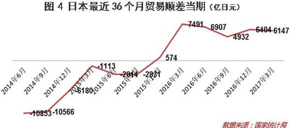 2、进出口顺差:安倍政府汲汲于日元贬值,醉翁之意无非在实现出口增加。从下图4可以看出,最近36个月,日本对外贸易(当期)在2016年前由于“J曲线效应”未快速改善,而自2015年底起,对外贸易已调整充分,实现了比较稳定的顺差。