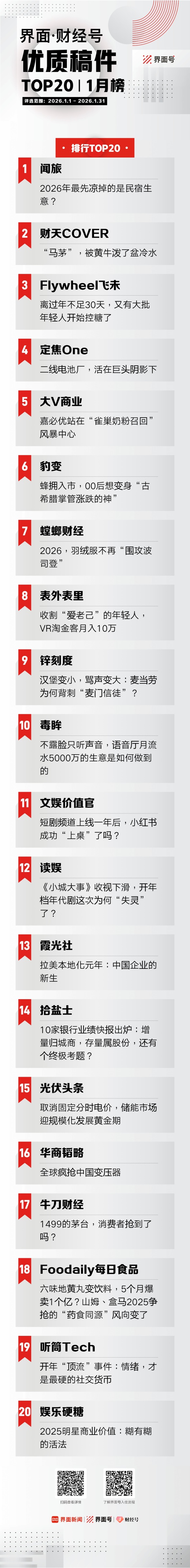 行走烟火人间,穿越四季光阴,界面·财经号1000多位成员立足于现实生活,持续观察千姿百态的商业现象,破解商业世界背后的秘密,在2026年1月1日至1月31日期间累计发文近2000篇。其中,以下20篇稿件脱颖而出,荣登《界面·财经号优质稿件TOP20|2026年1月榜》,用原创彰显独立思考的力量。