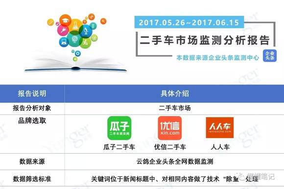 本期报告监测时段为5月26日至6月15日的三周时间,监测对象是瓜子二手车、优信二手车以及人人车等三个二手车电商平台。在分析报告中,企业头条与懂懂笔记对上述三个平台从多维度进行了对比分析。