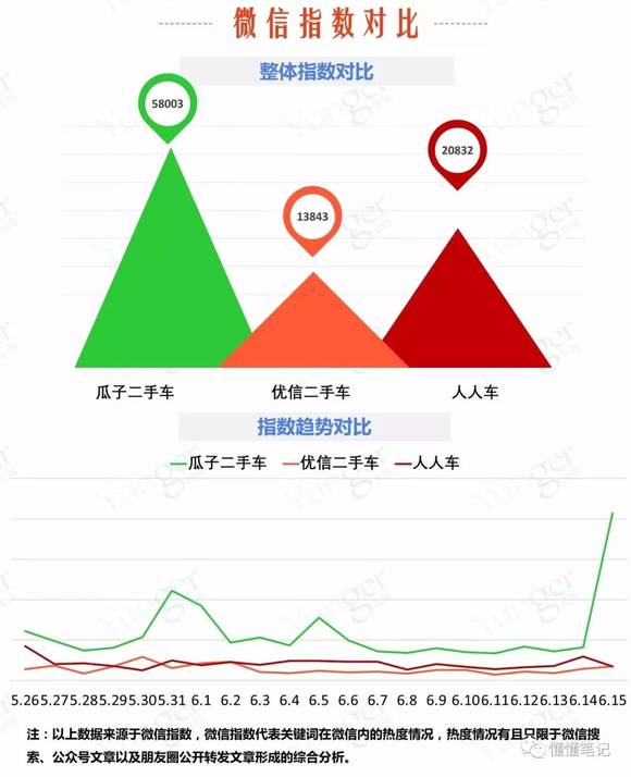 其次,在微信指数对比中,瓜子二手车表现出较大的领先优势,以58003排在第一位;人人车的微信指数为20832,优信二手车为13843。在微信指数趋势对比中,瓜子二手车的整体曲线都处于领先位置,并且在6月15日出现了较大幅度上升;优信二手车与人人车则呈现相互交替领先的现状。