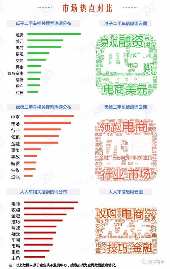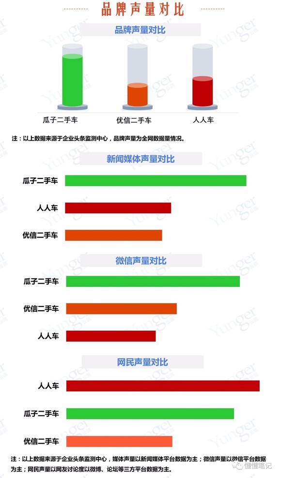 懂懂笔记继续从舆情角度来分析二手车行业,本期报告监测时段为5月26日至6月15日的三周时间,监测对象是瓜子二手车、优信二手车以及人人车等三个二手车电商平台。在分析报告中,企业头条与懂懂笔记对上述三个平台从多维度进行了对比分析。