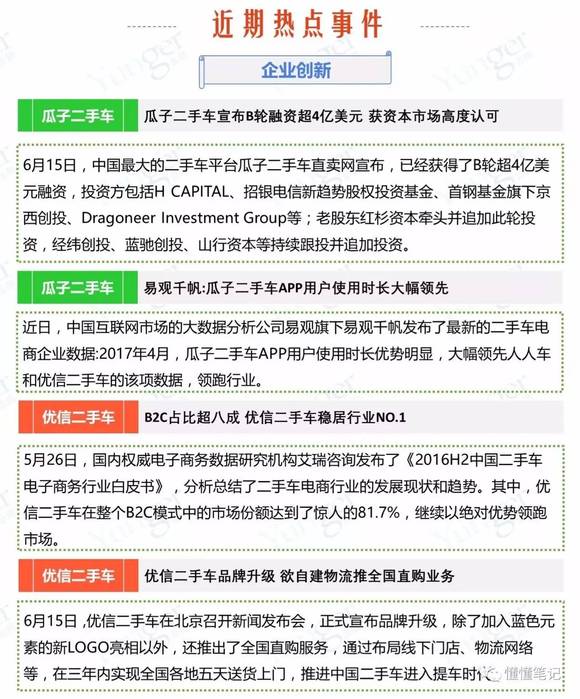 在这三周的监测中,懂懂笔记发现,三个平台都存在一定的创新。其中,瓜子二手车获得了新一轮融资,将在技术、团队、品牌等方面持续投入,核心技术“瓜子大脑”也在不断升级;优信二手车也寻求品牌升级,布局线下门店,推出全国直购服务。