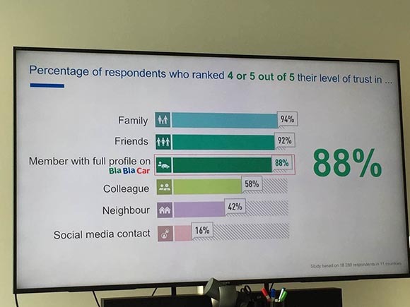 在最近一份发布在11个国家的18289份问卷中,用户对BlaBlaCar给出了较高的信任评价,88%的用户认为,BlaBlaCar中已认证司机的可信任程度仅次于亲人和朋友,而远高于同事、邻居和社交媒体上的个人信息。这与国内滴滴目前面临的信任危机完全不同。