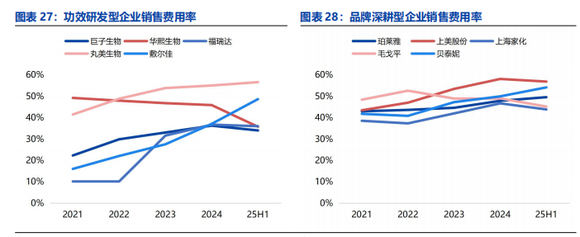 爱建证券研究院数据显示,国货功效研发型企业销售费用率多在40%以下,品牌深耕型企业则集中在40%-60%,且投入力度仍在上升。