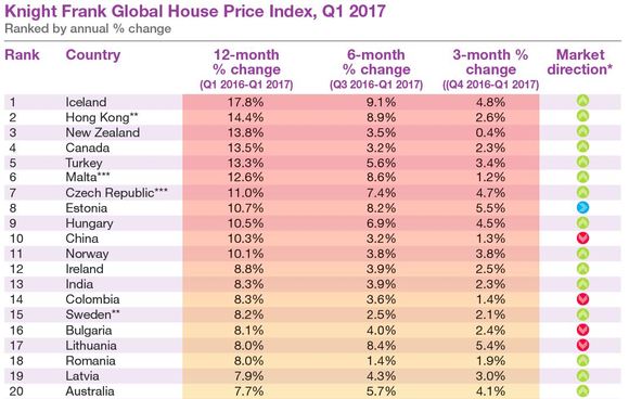 在欧洲地区,表现最好的国家依次是马耳他(12.6%),捷克(11%),爱沙尼亚(10.7%)和匈牙利(10.5%)。马耳他的经济扩张以及个人投资计划(the Individual Investor Programme ,简称IIP)是刺激房价攀升的两大主因。尽管2014年马耳他开始实施的IIP投资移民项目被视为“甩卖国籍”,但海外投资者们才不理会这些。与另外三国的增长类似,海外买家给欧洲的房产市场贡献了不少资金。