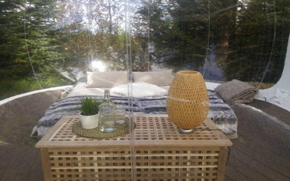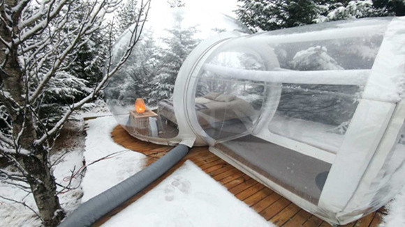泡泡房间更像是一个泡泡帐篷,采用PVC材质防水阻燃,透明的泡泡用鼓风机一吹,便成了一个温馨的小屋。由于狭窄的空间,室内并没有盥洗室,但酒店在泡泡周围配备了相应的公共区域:卫生间、淋浴室及自助厨房。