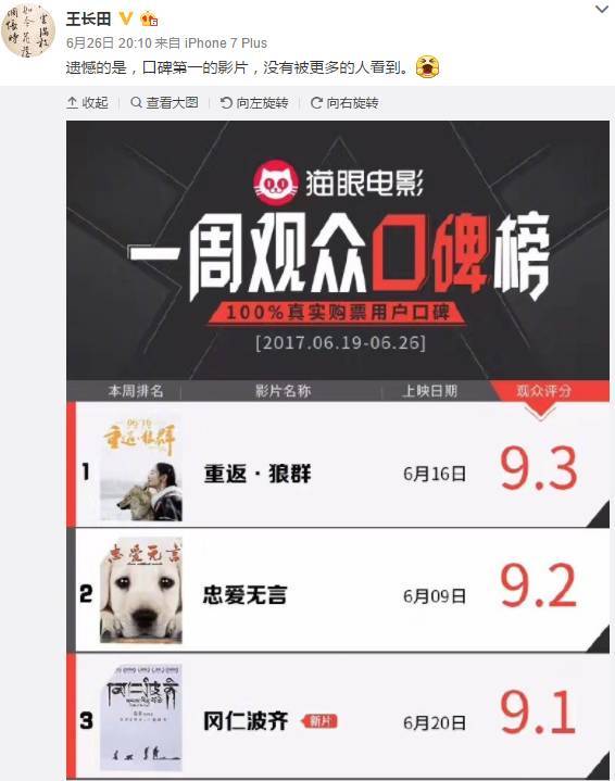 作为联合出品方和发行方的王长田也按捺不住,开始在自己的微博上为自家影片鸣不平。“遗憾的是,口碑第一的影片,没有被更多的人看到。(抓狂的表情)”