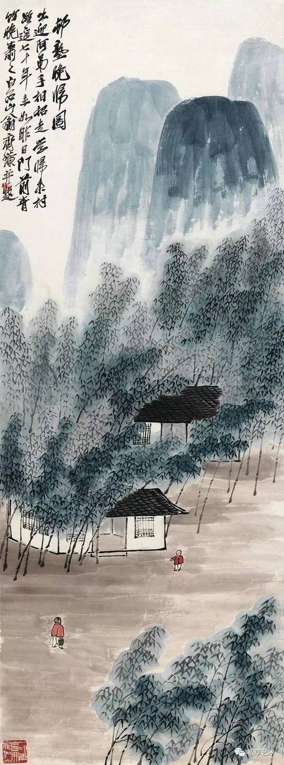 他的山水画,构图出奇出新,无常法而又合法,貌似平淡的笔调,大气磅礴、纯净明丽。在似与不似之间,把山水灵性的本质,或轻或重、或明或暗地表现出来,大开大合中又见细腻、朴素的善良与乐观的坚强。在白石老人的山水画中,每一笔似乎都含着家乡的泥土气息,每一根线条似乎都凝结着大自然的露珠,清新而华滋、深厚而通俗。