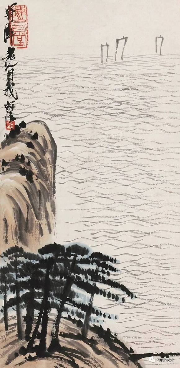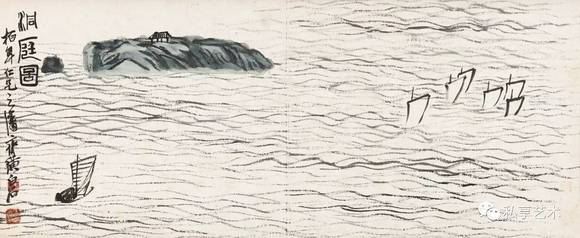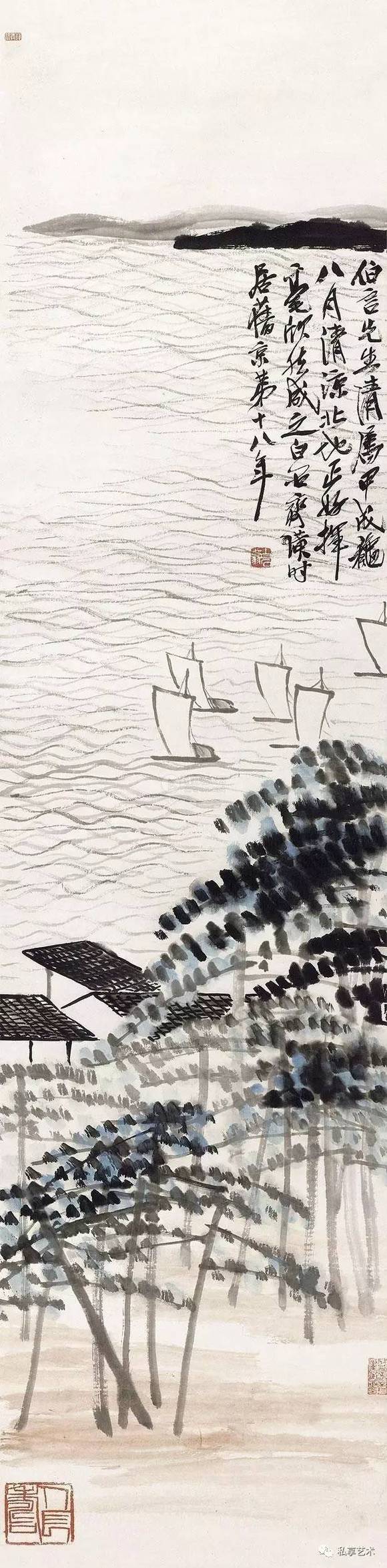 《烟帆海潮》是齐白石1922至1925年间的山水力作,画面上部是对峙的双峰,右侧还可见一座远山。下方片片帆影聚散不一,横涂的淡墨和竖抹的水痕营造出烟雨迷离的海面,据胡佩衡称,此种描绘雨雾的方式为齐白石独创。