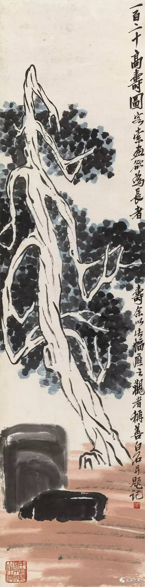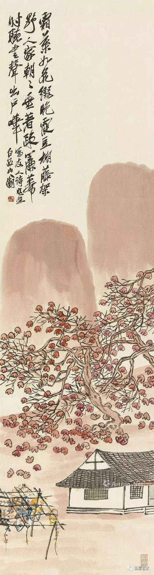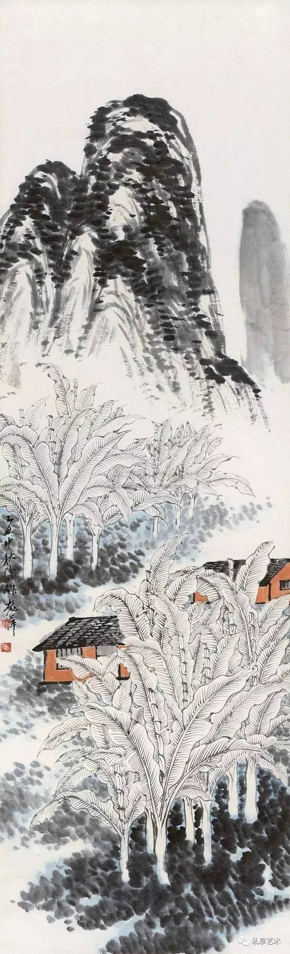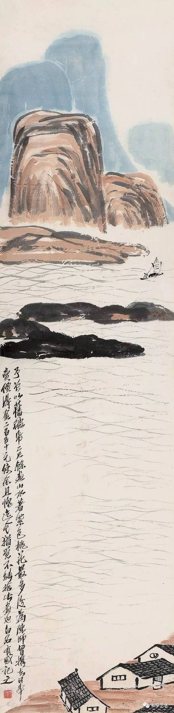 在齐白石的山水画中,横卷最少而立轴最多,而在立轴形式中,他又喜画狭长的尺幅,而颇少选择近于黄金律的长宽比,其山水如此,花鸟和人物亦如此,这也许是白石老人的偏爱或者是出于作画习惯。
