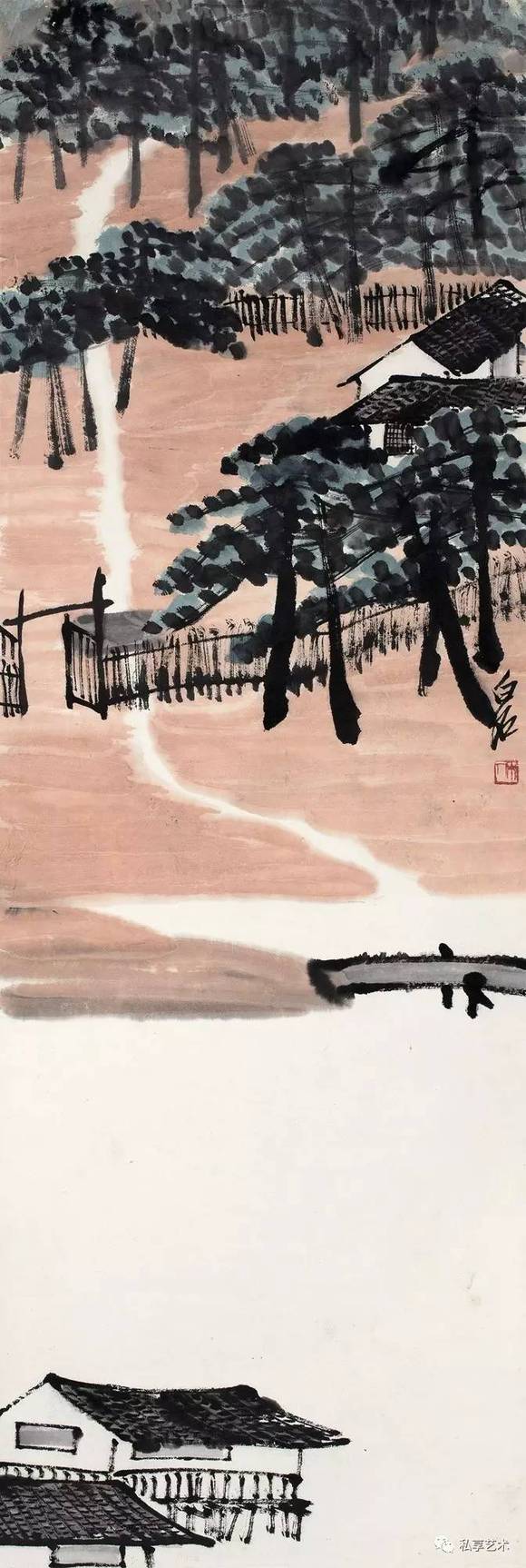 此幅《烟波万里图》正是这种狭长的尺幅,他画立轴山水,均以高远、平远为基本形式。此画面主要描绘江河,则选用的是平远法构图。近景为房屋、松柏、陆地,远景则是波光粼粼的水面,不见一只帆影。整个画面单纯简洁,却极会经营,极讲究聚散关系,又不乏引人入胜的细节刻画。齐白石的山水,是一个介于“出世”与“入世”之间的世界,是遥远的桃源仙境和平朴的田园牧歌相融合的世界,是他内心对自然,对生活的种种怀想与感悟。