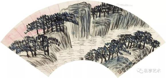 两抹远山浓淡对比十分强烈,显得清新淳朴,把秀美的远山韵致通过寥寥数笔表现出来;近景的松林,树干错落有致,淡墨居多,笔笔中锋,与其篆书用笔一致,篆籀气十足,松叶看似是简单的点苔排列,实则蕴含着强烈的节奏感,时浓时淡,浓墨处与远山相互照应,点线间处处藏锋,蕴藉典雅,淡青色轻晕郁郁葱葱,不突兀、不刻意,清新淡雅,松林间掩映着屋舍,使人心切依驰;中景是涟漪的湖光和渺渺帆影,湖水的用笔一任自然,简淡随性,显示出其书法艺术的高度。整幅作品总体来看显得虚空淡远,景致异常开阔,笔墨丰富而又对比鲜明,风格明显而又时见传统,老人目之所见,心之所想,情感真挚,具有浓厚的生活气息。